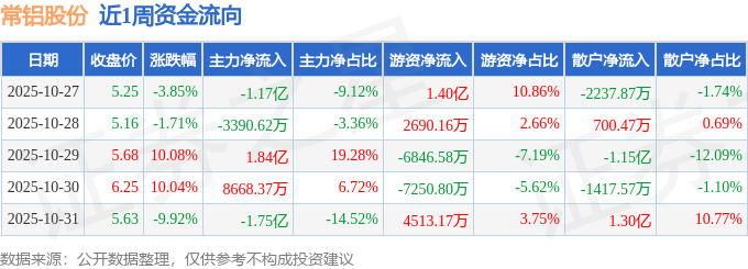资金流向数据方面,本周常铝股份主力资金合计净流出5576.62万元,游资资金合计净流入7084.97万元,散户资金合计净流出1508.35万元。本周资金流向一览见下表: