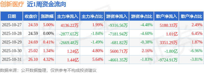 资金流向数据方面,本周创新医疗主力资金合计净流入2.54亿元,游资资金合计净流出1.62亿元,散户资金合计净流出9157.32万元。本周资金流向一览见下表: