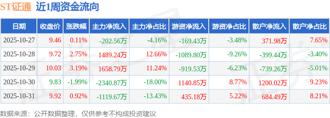 资金流向数据方面,本周ST证通主力资金合计净流出515.07万元,游资资金合计净流出602.73万元,散户资金合计净流入1117.8万元。本周资金流向一览见下表: