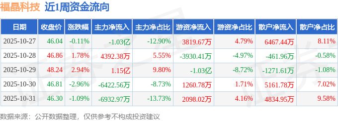 资金流向数据方面,本周福晶科技主力资金合计净流出7719.03万元,游资资金合计净流出7011.56万元,散户资金合计净流入1.47亿元。本周资金流向一览见下表: