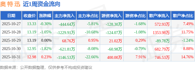 资金流向数据方面,本周奥 特 迅主力资金合计净流出3374.13万元,游资资金合计净流入107.68万元,散户资金合计净流入3266.46万元。本周资金流向一览见下表: