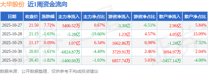 资金流向数据方面,本周大华股份主力资金合计净流出4.69亿元,游资资金合计净流出8436.22万元,散户资金合计净流入5.53亿元。本周资金流向一览见下表: