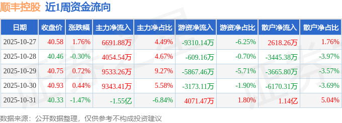 资金流向数据方面,本周顺丰控股主力资金合计净流入1.41亿元,游资资金合计净流出1.49亿元,散户资金合计净流入746.7万元。本周资金流向一览见下表: