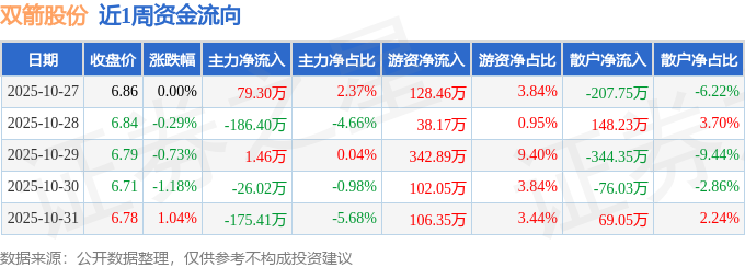 资金流向数据方面,本周双箭股份主力资金合计净流出307.07万元,游资资金合计净流入717.92万元,散户资金合计净流出410.86万元。本周资金流向一览见下表: