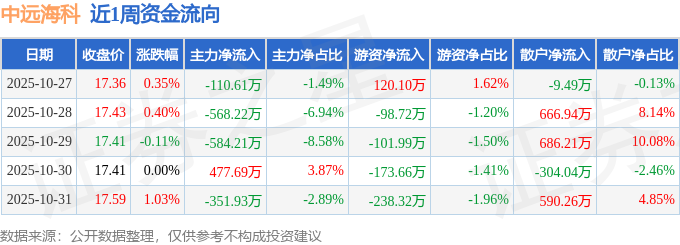 资金流向数据方面,本周中远海科主力资金合计净流出1137.28万元,游资资金合计净流出492.6万元,散户资金合计净流入1629.88万元。本周资金流向一览见下表: