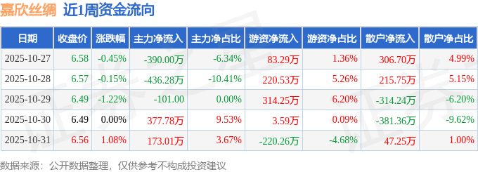 资金流向数据方面,本周嘉欣丝绸主力资金合计净流出275.49万元,游资资金合计净流入401.4万元,散户资金合计净流出125.9万元。本周资金流向一览见下表: