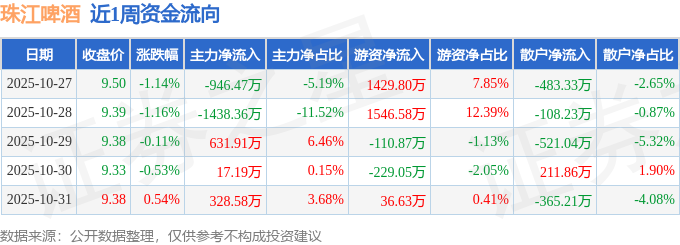 资金流向数据方面,本周珠江啤酒主力资金合计净流出1407.14万元,游资资金合计净流入2673.09万元,散户资金合计净流出1265.95万元。本周资金流向一览见下表: