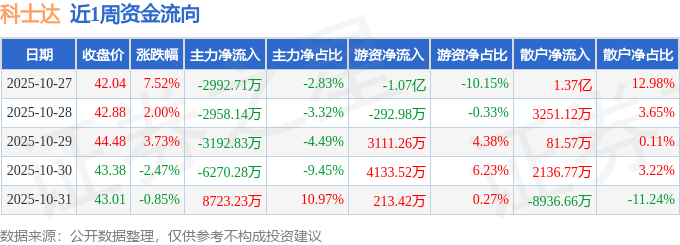 资金流向数据方面,本周科士达主力资金合计净流出6690.73万元,游资资金合计净流出3579.86万元,散户资金合计净流入1.03亿元。本周资金流向一览见下表: