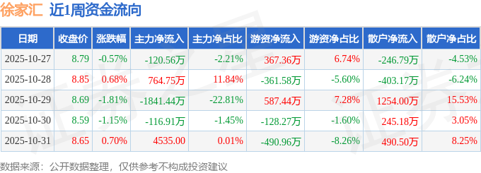 资金流向数据方面,本周徐家汇主力资金合计净流出1313.71万元,游资资金合计净流出26.01万元,散户资金合计净流入1339.71万元。本周资金流向一览见下表: