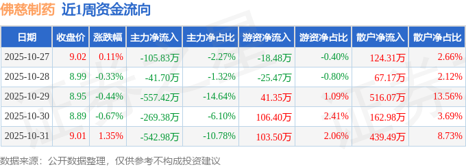 资金流向数据方面,本周佛慈制药主力资金合计净流出1517.31万元,游资资金合计净流入207.29万元,散户资金合计净流入1310.02万元。本周资金流向一览见下表: