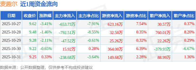 资金流向数据方面,本周麦趣尔主力资金合计净流出1716.51万元,游资资金合计净流入1194.6万元,散户资金合计净流入521.9万元。本周资金流向一览见下表: