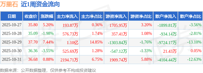 资金流向数据方面,本周万里石主力资金合计净流入1.45亿元,游资资金合计净流入2122.13万元,散户资金合计净流出1.66亿元。本周资金流向一览见下表: