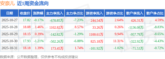 资金流向数据方面,本周安奈儿主力资金合计净流出39.66万元,游资资金合计净流入2101.66万元,散户资金合计净流出2062.01万元。本周资金流向一览见下表: