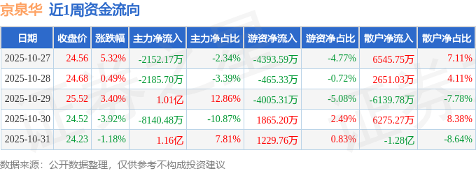 资金流向数据方面,本周京泉华主力资金合计净流入9258.11万元,游资资金合计净流出5769.25万元,散户资金合计净流出3488.85万元。本周资金流向一览见下表: