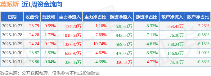 资金流向数据方面,本周英派斯主力资金合计净流入2817.33万元,游资资金合计净流出2166.14万元,散户资金合计净流出651.19万元。本周资金流向一览见下表: