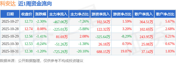 资金流向数据方面,本周科安达主力资金合计净流出1386.94万元,游资资金合计净流入613.57万元,散户资金合计净流入773.38万元。本周资金流向一览见下表: