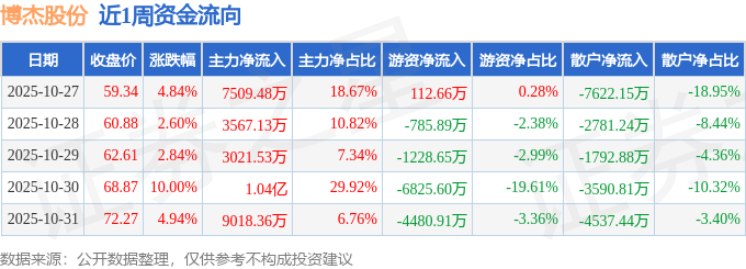 资金流向数据方面,本周博杰股份主力资金合计净流入3.35亿元,游资资金合计净流出1.32亿元,散户资金合计净流出2.03亿元。本周资金流向一览见下表: