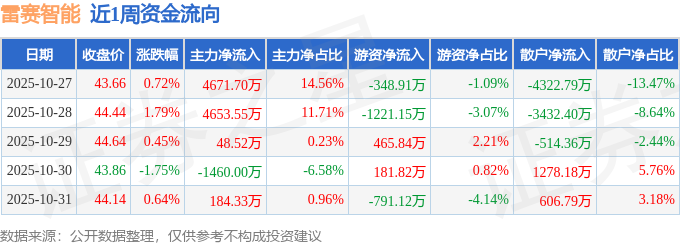 资金流向数据方面,本周雷赛智能主力资金合计净流入8098.09万元,游资资金合计净流出1713.52万元,散户资金合计净流出6384.58万元。本周资金流向一览见下表: