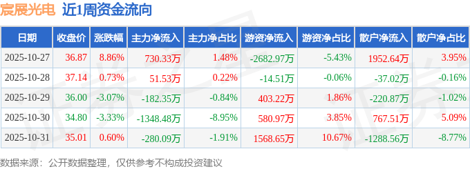 资金流向数据方面,本周宸展光电主力资金合计净流出1029.06万元,游资资金合计净流出144.65万元,散户资金合计净流入1173.71万元。本周资金流向一览见下表: