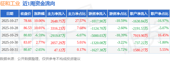 资金流向数据方面,本周征和工业主力资金合计净流入5149.51万元,游资资金合计净流出1.01亿元,散户资金合计净流入4940.58万元。本周资金流向一览见下表: