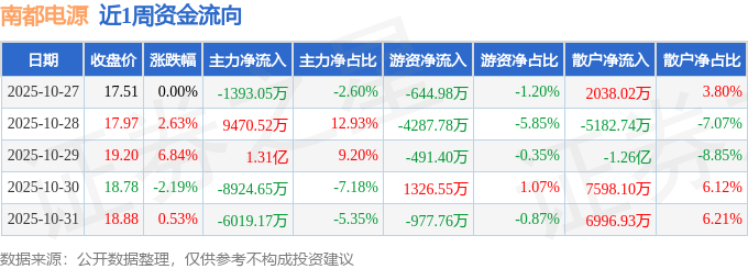 资金流向数据方面,本周南都电源主力资金合计净流入6226.17万元,游资资金合计净流出5075.37万元,散户资金合计净流出1150.81万元。本周资金流向一览见下表: