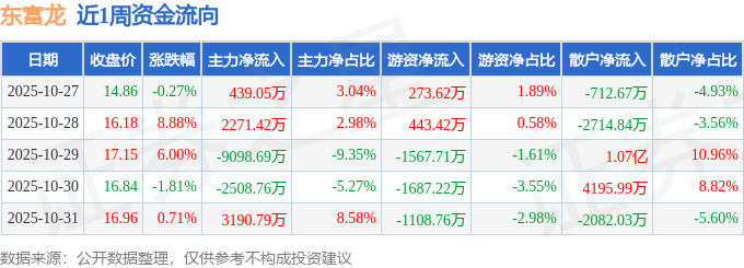 资金流向数据方面,本周东富龙主力资金合计净流出5706.19万元,游资资金合计净流出3646.65万元,散户资金合计净流入9352.85万元。本周资金流向一览见下表: