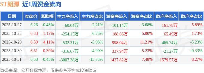 资金流向数据方面,本周ST朗源主力资金合计净流出4171.15万元,游资资金合计净流入2851.32万元,散户资金合计净流入1319.82万元。本周资金流向一览见下表: