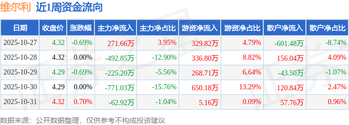 资金流向数据方面,本周维尔利主力资金合计净流出1280.34万元,游资资金合计净流入1590.68万元,散户资金合计净流出310.34万元。本周资金流向一览见下表: