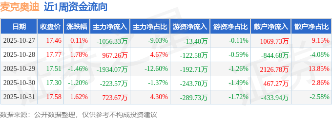 资金流向数据方面,本周麦克奥迪主力资金合计净流出1523.04万元,游资资金合计净流出862.12万元,散户资金合计净流入2385.16万元。本周资金流向一览见下表: