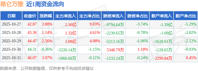资金流向数据方面,本周昆仑万维主力资金合计净流入4.14亿元,游资资金合计净流出1.31亿元,散户资金合计净流出2.82亿元。本周资金流向一览见下表: