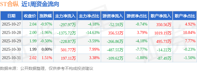 资金流向数据方面,本周ST合纵主力资金合计净流出1203.68万元,游资资金合计净流出560.09万元,散户资金合计净流入1763.77万元。本周资金流向一览见下表: