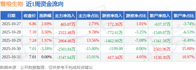 资金流向数据方面,本周雪榕生物主力资金合计净流入1540.55万元,游资资金合计净流出1645.99万元,散户资金合计净流入105.44万元。本周资金流向一览见下表: