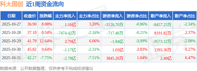 资金流向数据方面,本周科大国创主力资金合计净流出7480.13万元,游资资金合计净流出8038.36万元,散户资金合计净流入1.55亿元。本周资金流向一览见下表: