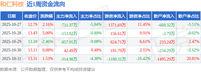 资金流向数据方面,本周和仁科技主力资金合计净流出1995.63万元,游资资金合计净流入1164.49万元,散户资金合计净流入831.14万元。本周资金流向一览见下表: