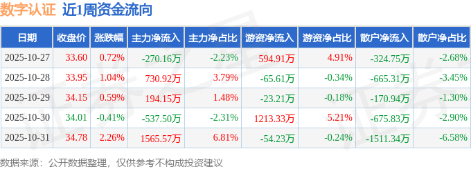 资金流向数据方面,本周数字认证主力资金合计净流入1682.98万元,游资资金合计净流入1665.19万元,散户资金合计净流出3348.17万元。本周资金流向一览见下表: