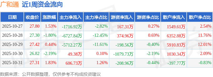 资金流向数据方面,本周广和通主力资金合计净流出1.35亿元,游资资金合计净流出944.98万元,散户资金合计净流入1.44亿元。本周资金流向一览见下表: