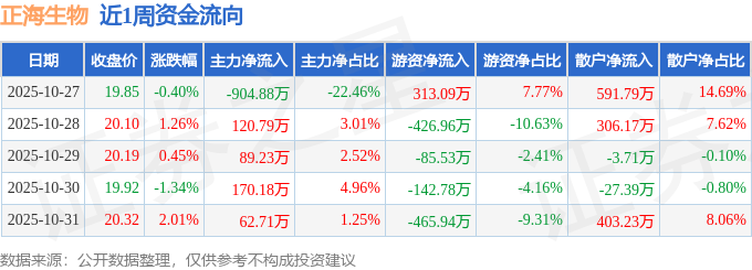 资金流向数据方面,本周正海生物主力资金合计净流出461.97万元,游资资金合计净流出808.12万元,散户资金合计净流入1270.08万元。本周资金流向一览见下表: