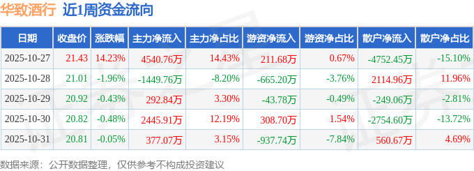 资金流向数据方面,本周华致酒行主力资金合计净流入6206.82万元,游资资金合计净流出1126.34万元,散户资金合计净流出5080.49万元。本周资金流向一览见下表: