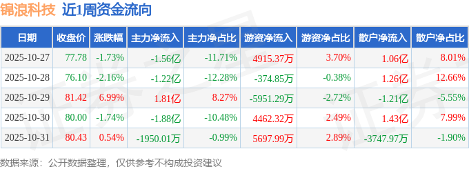 资金流向数据方面,本周锦浪科技主力资金合计净流出3.04亿元,游资资金合计净流入8749.54万元,散户资金合计净流入2.16亿元。本周资金流向一览见下表: