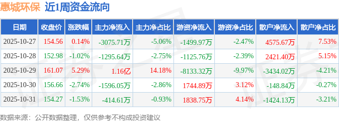 资金流向数据方面,本周惠城环保主力资金合计净流入5185.33万元,游资资金合计净流出7175.41万元,散户资金合计净流入1990.08万元。本周资金流向一览见下表: