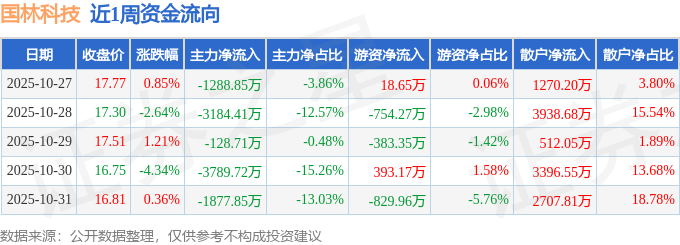 资金流向数据方面,本周国林科技主力资金合计净流出1.03亿元,游资资金合计净流出1555.76万元,散户资金合计净流入1.18亿元。本周资金流向一览见下表: