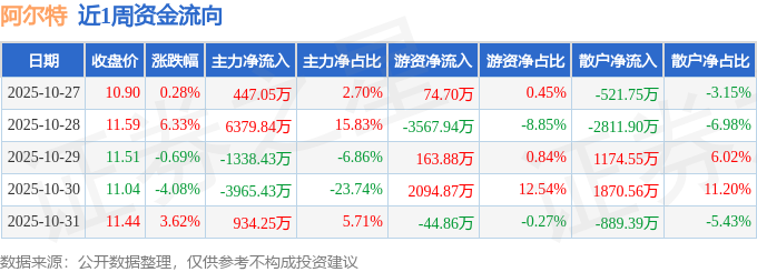 资金流向数据方面,本周阿尔特主力资金合计净流入2457.27万元,游资资金合计净流出1279.34万元,散户资金合计净流出1177.93万元。本周资金流向一览见下表: