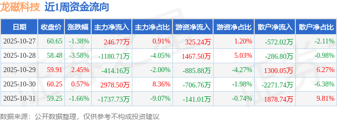 资金流向数据方面,本周龙磁科技主力资金合计净流出107.32万元,游资资金合计净流入59.09万元,散户资金合计净流入48.23万元。本周资金流向一览见下表: