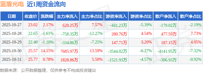 资金流向数据方面,本周蓝盾光电主力资金合计净流入9041.87万元,游资资金合计净流出5078.71万元,散户资金合计净流出3963.16万元。本周资金流向一览见下表: