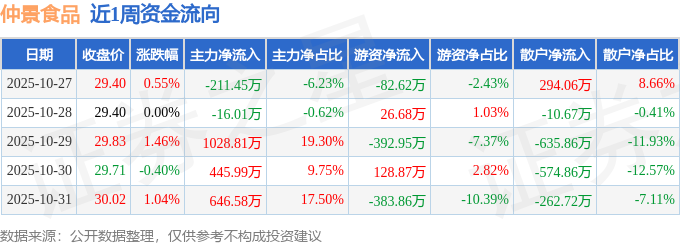 资金流向数据方面,本周仲景食品主力资金合计净流入1893.93万元,游资资金合计净流出703.88万元,散户资金合计净流出1190.04万元。本周资金流向一览见下表:
