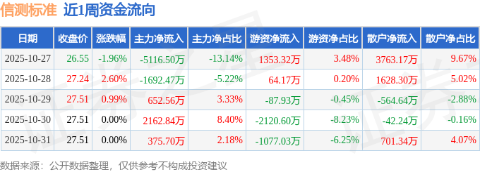资金流向数据方面,本周信测标准主力资金合计净流出3617.87万元,游资资金合计净流出1868.06万元,散户资金合计净流入5485.93万元。本周资金流向一览见下表: