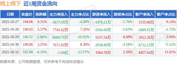 资金流向数据方面,本周线上线下主力资金合计净流出6752.37万元,游资资金合计净流出3231.49万元,散户资金合计净流入9983.85万元。本周资金流向一览见下表: