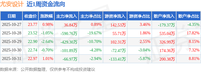 资金流向数据方面,本周尤安设计主力资金合计净流出1152.08万元,游资资金合计净流入94.68万元,散户资金合计净流入1057.4万元。本周资金流向一览见下表: