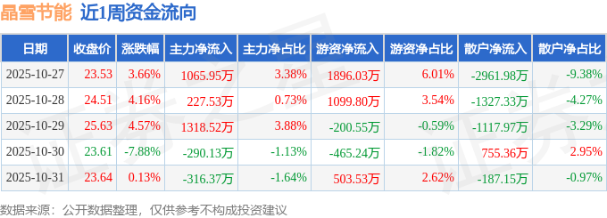 资金流向数据方面,本周晶雪节能主力资金合计净流入2005.5万元,游资资金合计净流入2833.56万元,散户资金合计净流出4839.07万元。本周资金流向一览见下表: