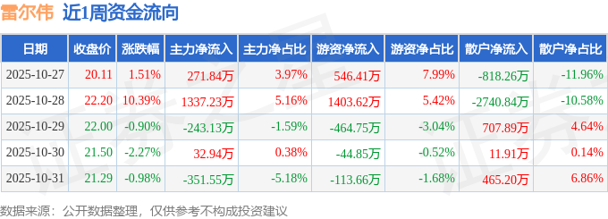 资金流向数据方面,本周雷尔伟主力资金合计净流入1047.33万元,游资资金合计净流入1326.77万元,散户资金合计净流出2374.1万元。本周资金流向一览见下表: